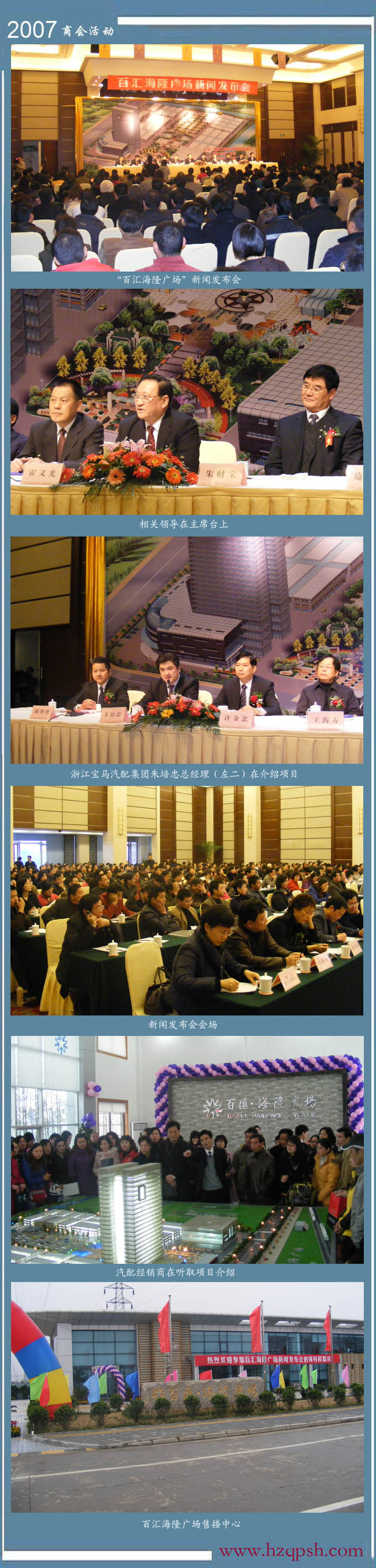 由全國(guó)汽摩配用品商會(huì)、浙江省市場(chǎng)協(xié)會(huì)、海寧市經(jīng)濟(jì)開發(fā)區(qū)和浙江寶馬汽配集團(tuán)主辦的“百匯海隆廣場(chǎng)”新聞發(fā)布會(huì),于2007年12月16日在海寧市海州大酒店隆重舉行。全國(guó)工商聯(lián)汽摩配用品商會(huì)會(huì)長(zhǎng)霍義光、浙江省工商管理局常務(wù)副局長(zhǎng)、浙江省市場(chǎng)協(xié)會(huì)會(huì)長(zhǎng)徐志祥、浙江省市場(chǎng)協(xié)會(huì)秘書長(zhǎng)呂振華、海寧市人大、政府、政協(xié)、經(jīng)濟(jì)開發(fā)區(qū)相關(guān)領(lǐng)導(dǎo)出席了會(huì)議。杭州市汽配用品商會(huì)組織了130余家汽配經(jīng)銷商,赴海寧市參加了“百匯海隆廣場(chǎng)”新聞發(fā)布會(huì),并游覽了海寧皮革市場(chǎng)。