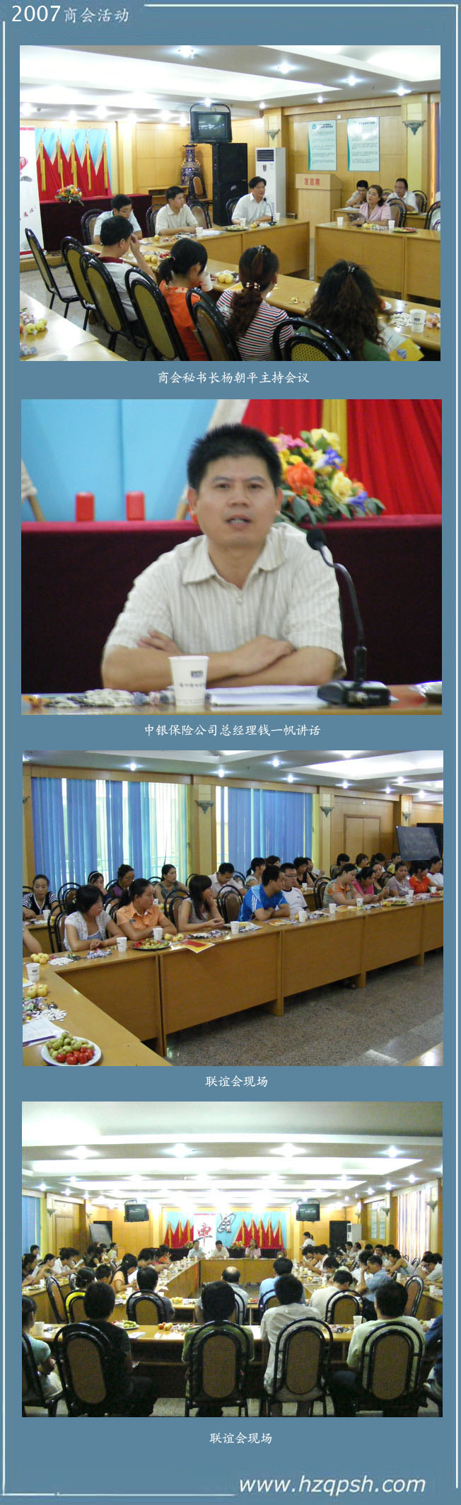 2007年8月30日下午1時(shí)30分,在浙江汽配城三樓大會(huì)議室,約100余家企業(yè)負(fù)責(zé)人參加了會(huì)議。通過(guò)中銀保險(xiǎn)公司的介紹,許多企業(yè)紛紛要求參加保險(xiǎn)。聯(lián)誼會(huì)后,商會(huì)將積極組織會(huì)員以團(tuán)購(gòu)的形式與中銀保險(xiǎn)公司合作,使更多的企業(yè)通過(guò)參加保險(xiǎn),將可能出現(xiàn)的意外損失,降到到最低。