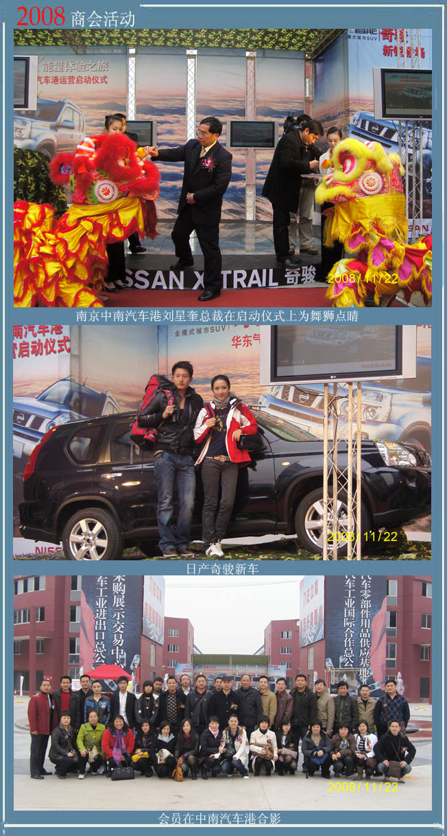 2008年11月24日,應(yīng)南京中南汽車港的邀請,商會組織40余會員赴南京考察。上午會員參觀了中南汽車港,參加了中南汽車港運營啟動儀式及日產(chǎn)奇駿四輪驅(qū)動新車發(fā)布儀式。下午會員們?yōu)g覽了南京中山陵。