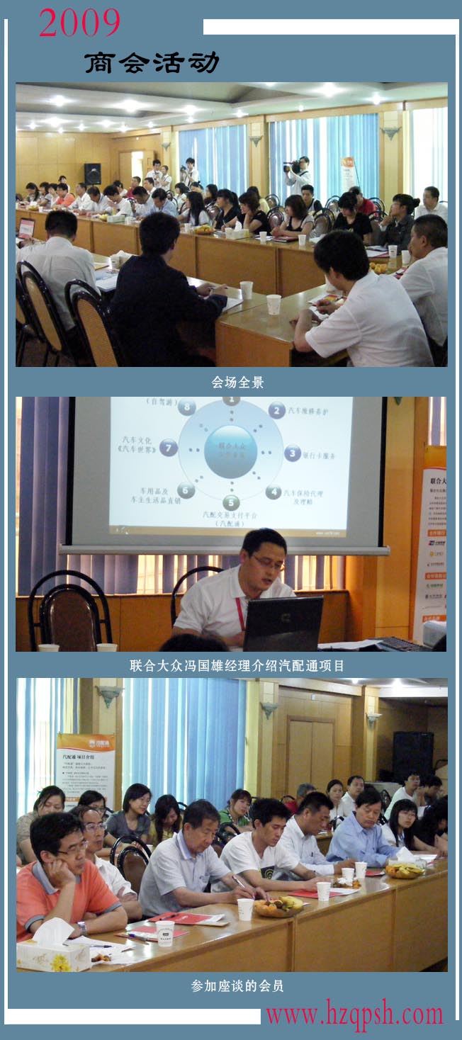 2009年5月8日杭州市汽車配件用品商會與杭州聯(lián)合大眾汽車網(wǎng)絡(luò)有限公司,在浙江汽配城會議室召開汽配通項目座談會,參加會議的有聯(lián)合大眾公司主要成員及三十余位商會副會長、常務(wù)理事、理事。