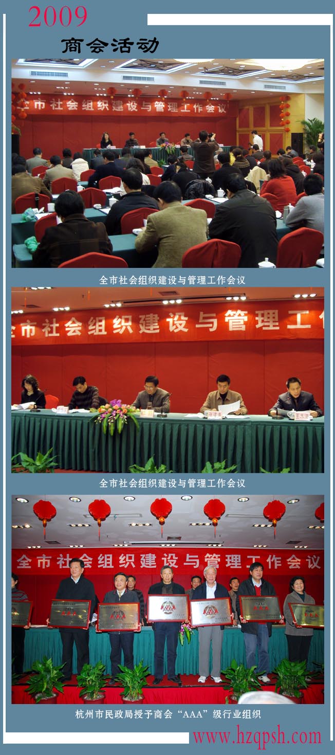2009年3月12日杭州市民政局在浙江大酒店召開《全市社會(huì)組織建設(shè)與管理工作會(huì)議》,民政局張建濤副局長(zhǎng)主持會(huì)議,民間組織管理局王木清局長(zhǎng)做2008年工作總結(jié)和09年工作部署報(bào)告,張佳佳副局長(zhǎng)宣讀社會(huì)組織評(píng)估情況通報(bào),并向獲得AAA級(jí)以上的社會(huì)組織頒發(fā)獎(jiǎng)牌和證書。