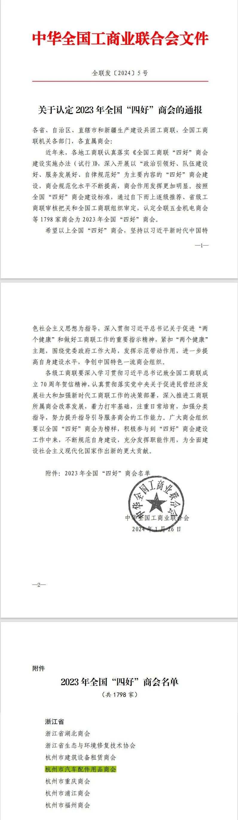 2024年1月26日,全國工商業(yè)聯(lián)合會(huì)辦公廳印發(fā)全聯(lián)發(fā)〔2024〕5 號(hào)《關(guān)于認(rèn)定 2023 年全國“四好”商會(huì)的通報(bào)》,杭州市汽車配件用品商會(huì)榮獲全國“四好”商會(huì)稱號(hào)。