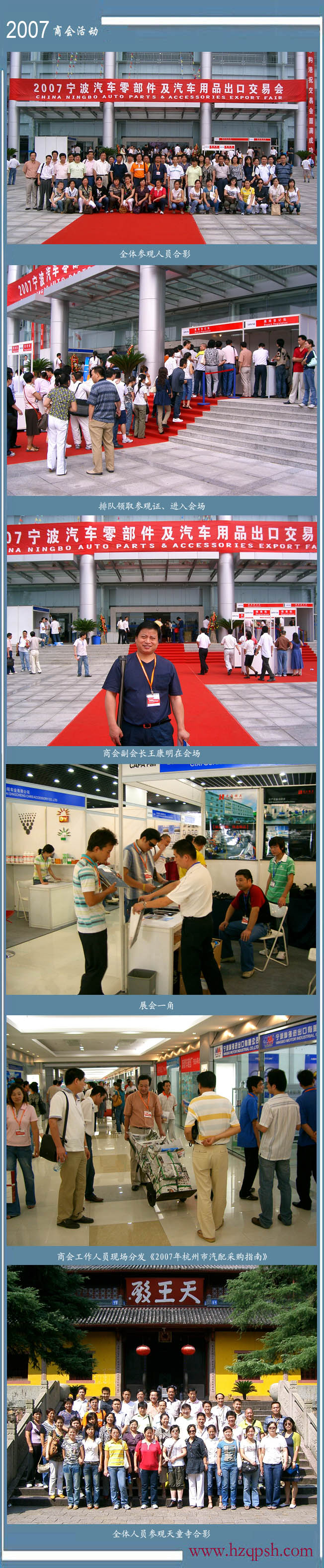 汽配展組委會(huì)盛情邀請(qǐng)杭州市汽配用品商會(huì)組團(tuán)參觀(guān)。商會(huì)于2007年9月13日組織了50余家采購(gòu)商參觀(guān)了展會(huì)。會(huì)后瀏覽了寧波天童寺。